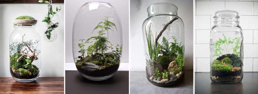 Pentru a crea pădurea noastră de casă, putem folosi în recipientele din sticlă mușchi sau ferigi mici (Pteris cretica – Feriga scoarță, Adiantum – Părul fetei), care se simt bine în astfel de condiții. Printre plantele care se pretează unei astfel de grădini se numără: cryptanthus, fittonia, gasteria, haworthia, maranta, episcia, spathiphyllum sau selaginella. Se vor simți la fel de bune și plantele insectivore ca roua-cerului sau dionaea muscipula. Importantă este și alegerea locului de expunere a naturii create, pereții vasului funcționând ca și o seră, astfel că, lăsat în plin soare se va încălzi puternic, de aceea este bine să alegem un loc ușor umbrit. Dacă avem o grădină creată într-o damigeană pentru fermentarea vinului, putem pune un dop de plută, însă atunci când pe pereții vasului se vor forma picături de apă trebuie sa o deschidem pentru a se aerisi.