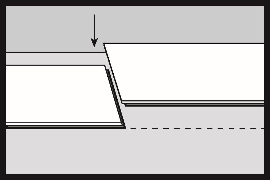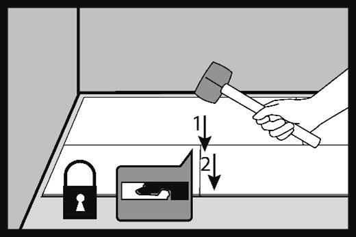 Loviți ușor îmbinarea marginii cu un ciocan nereflectant (de nisip sau din cauciuc alb) și fixați prinderea în ordinea lovirii 1 și 2. Atunci când prinderea este bine fixată, stratul superior al panourilor ar trebui să fie într-un singur plan și să nu existe diferențe vizibile de nivel între elementele conectate.
