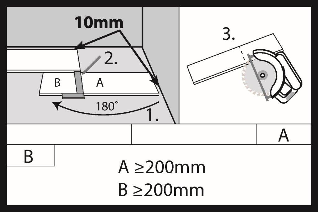 Pentru tăierea panourilor, se poate folosi un ferăstrău manual sau electric. Nu uitați să lăsați un spațiu de dilatație de cel puțin 10 mm după tăierea ultimului panou. Lungimea recomandată a ultimului panou tăiat (A) din primul rând al podelei trebuie să fie de min. 200 mm. Dacă piesa tăiată (B) este mai lungă de 200 mm, o putem folosi pentru a începe instalarea celui de-al doilea rând. Distanța dintre rosturile de capăt dintre două rânduri de podea adiacente trebuie să fie de cel puțin 200 mm.