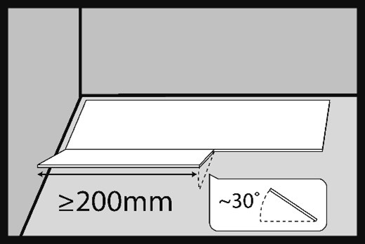 Primul panou SPC în al doilea rând se introduce la un unghi de aproximativ 30° în blocajul panoului din primul rând. Lungimea recomandată a panoului SPC instalat ar trebui să fie de min. 200 mm.