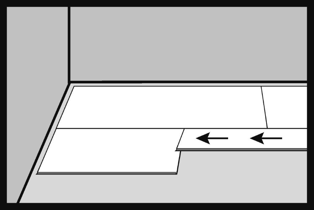 Atașați la marginea primului panou SPC marginea scurtă a celui de-al doilea panou. Asigurați-vă că marginile sunt aliniate exact. Panourile îmbinate trebuie conectate precis într-o singură linie.