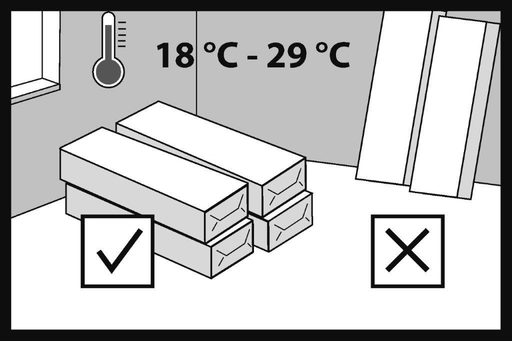 Pardoseala trebuie depozitată în ambalajul original, în încăperea în care urmează să fie instalată, timp de cel puțin 24 de ore pentru a se aclimatiza. Temperatura ambientală trebuie să fie între +18°C și +29°C.