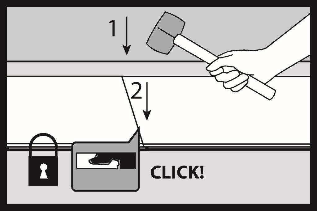 Bate ușor cu un ciocan ne-rebound (cu nisip sau din cauciuc alb) la îmbinarea marginii și închide mecanismul de blocare în ordinea lovirii punctelor 1 și 2. Atunci când mecanismul de blocare este corect închis, stratul superior al plăcilor ar trebui să fie la același nivel, iar între elementele îmbinate nu ar trebui să existe o diferență vizibilă de înălțime.
