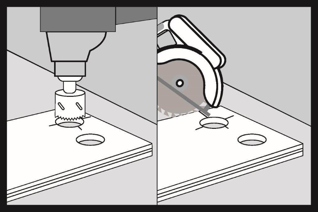 Tăiem găuri în panoul SPC. Trasăm o linie prin centrul găurilor și folosim un ferăstrău pentru a tăia panoul.