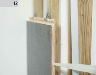 8. Pe construcţia din şipci de lemn aplicăm adezivul pentru constructii sau pentru lemn (până la înălţimea unui element de parchet) Primul element de parchet (cu nutul tăiat) îl punem pe constructia existenta, şi îl fixam de partea de sus cu ajutorul clipsului.