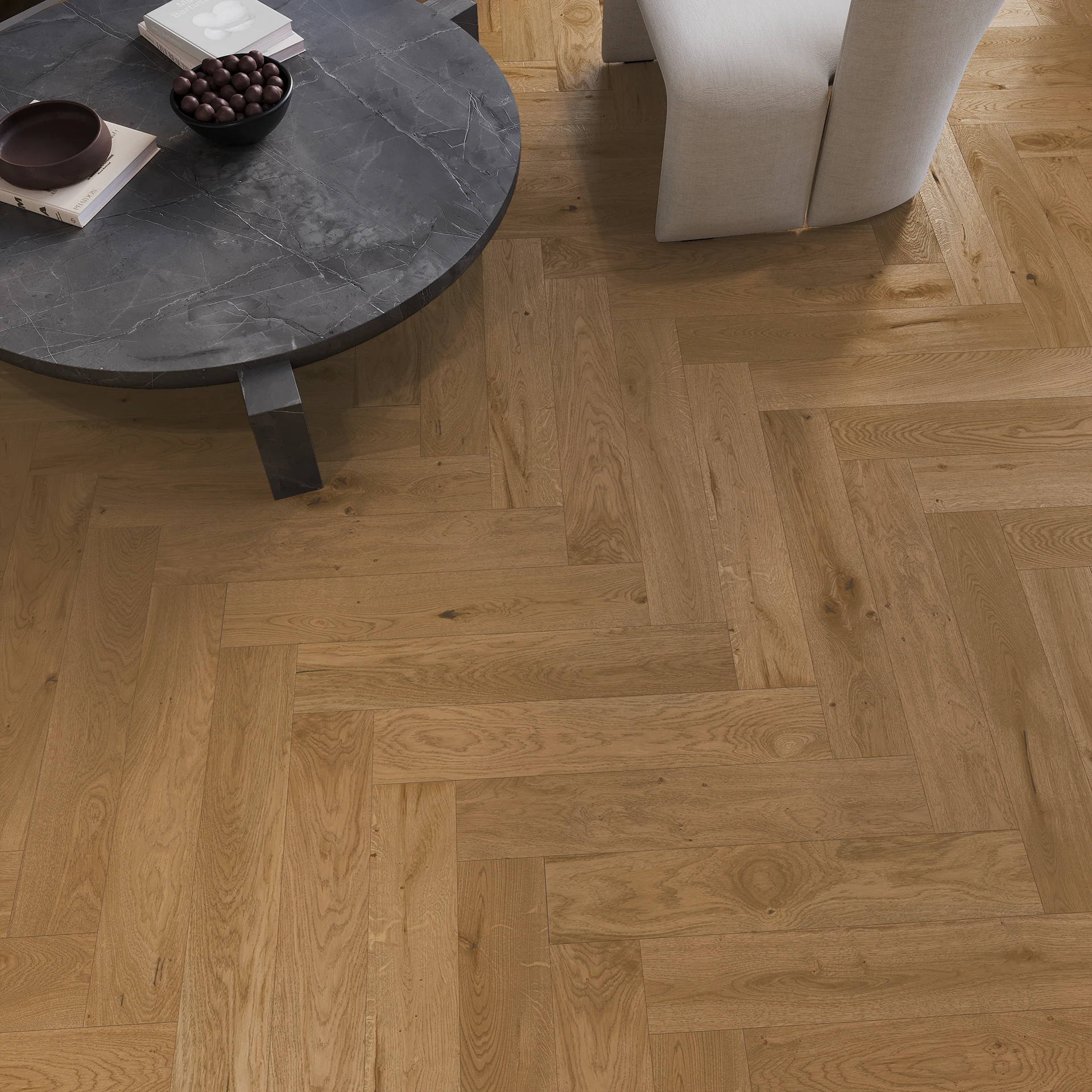 Pardoseală de stejar finisată cu o nuanță maro caldă, caracteristicile lemnului sunt puternic accentuate. Desenul inelelor a fost evidențiat prin periaj, iar canelurile pe cele patru laturi au înobilat pardoseala. Acoperită cu un lac mat.
