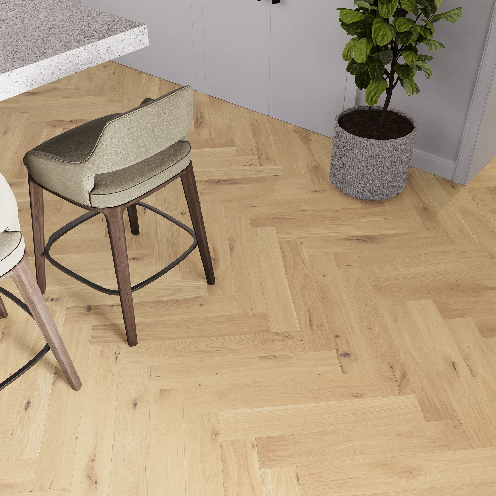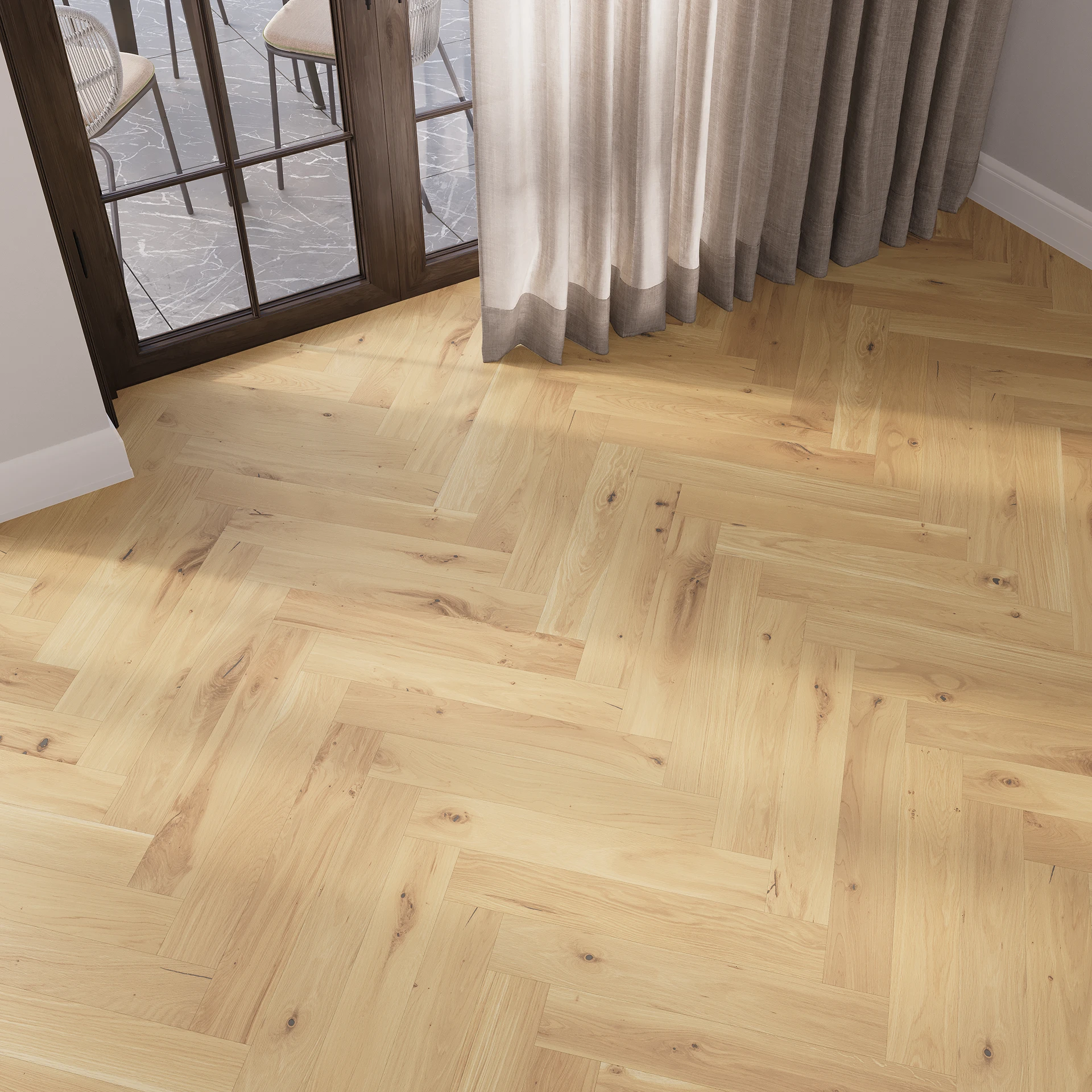 Pardoseală din stejar de o culoare care imită lemnul brut și care a fost obținută datorită utilizării unui mod unic de finisare. Subtilitatea pardoselii este conferită de canelurile de pe cele patru laturi, iar desenul inelelor a fost evidențiat prin periaj. Finisată cu ulei natural.