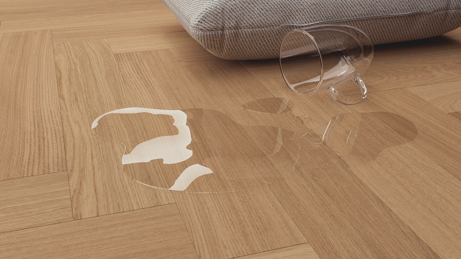 O pardoseală clasică de stejar herringbone, într-o nuanță delicată, cremoasă, aduce căldură și armonie interiorului. Lemnul deschis la culoare luminează spațiul, iar textura periată evidențiază fibra naturală.