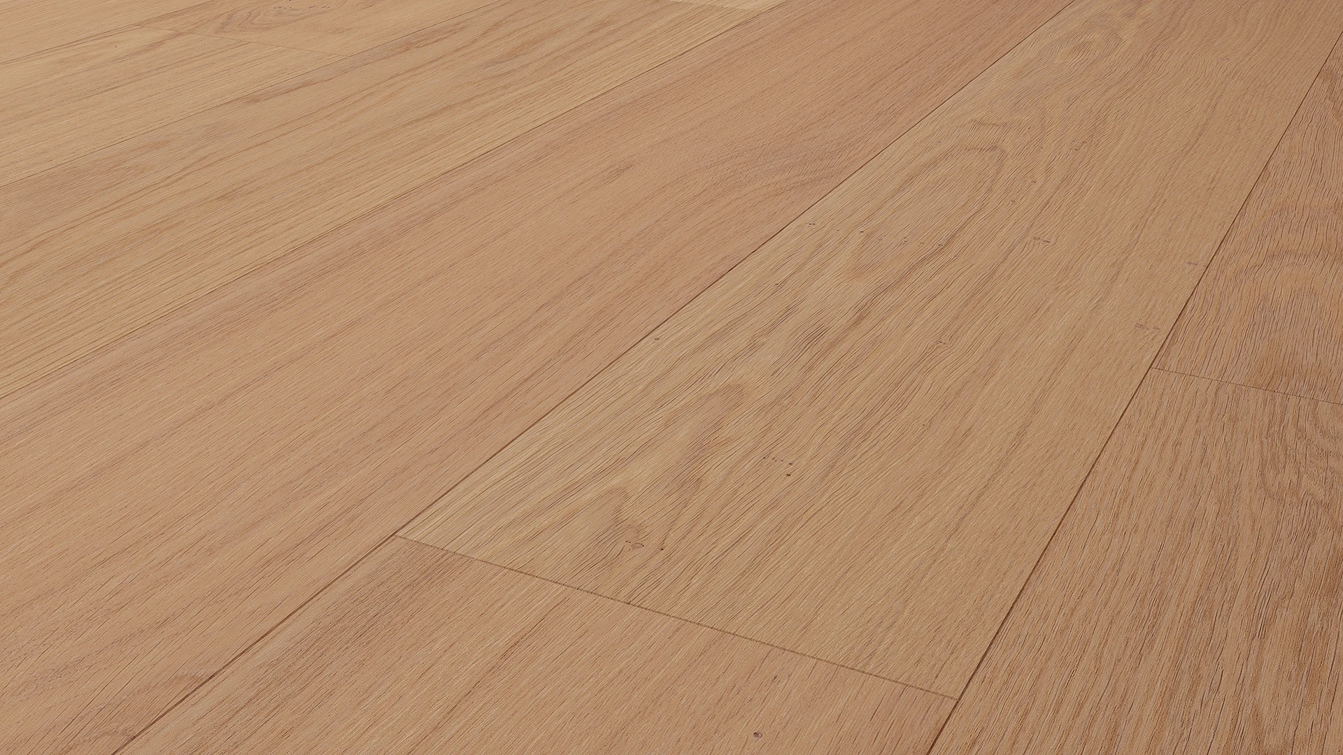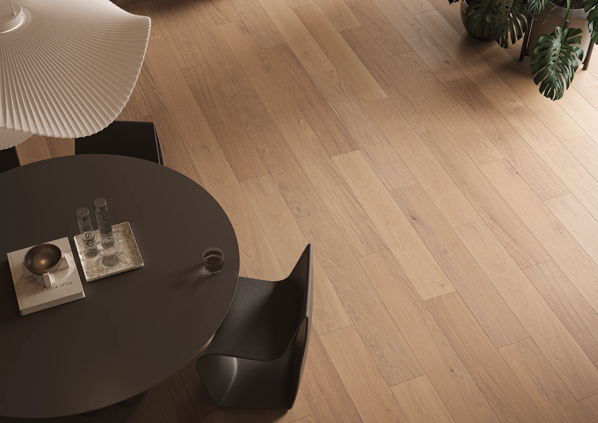 O pardoseală din stejar ușor albită combină eleganța subtilă cu un stil natural. Văruirea delicată evidențiază fibra lemnului, luminează lemnul și conferă interiorului un caracter proaspăt și armonios.