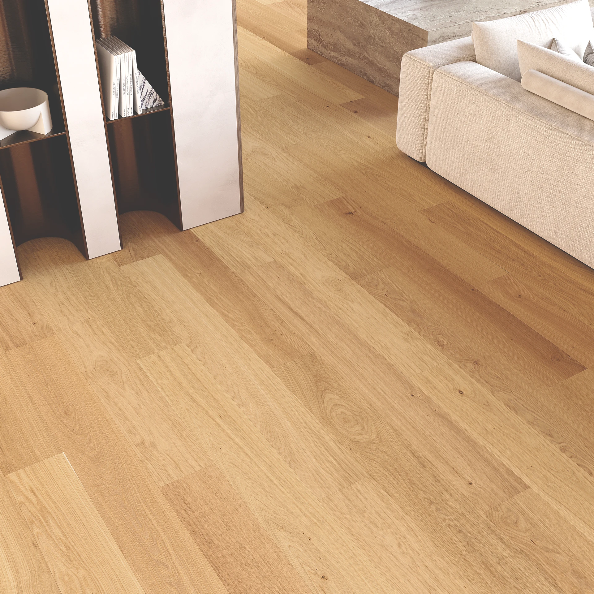 O pardoseală din stejar natural, cu caracteristici subtil accentuate ale lemnului. Suprafața periată evidențiază frumos fibra lemnului, conferind pardoselii un caracter autentic și un aspect rafinat.