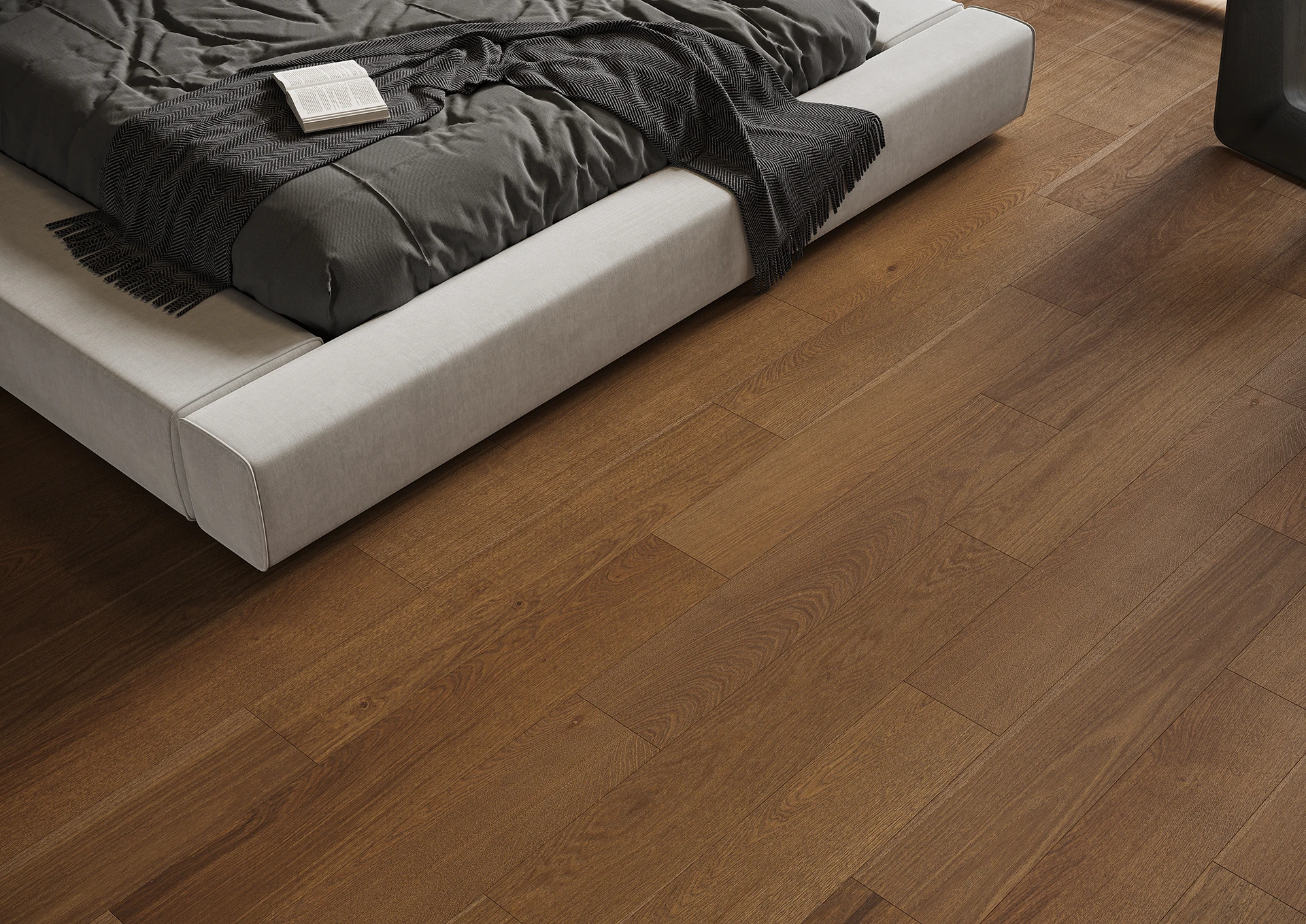 Parchetul din stejar, într-o nuanță maro închis, captivează prin eleganța și stilul său distinctiv. Culoarea intensă evidențiază fibra naturală, conferind interiorului o notă de rafinament și o profunzime excepțională.
