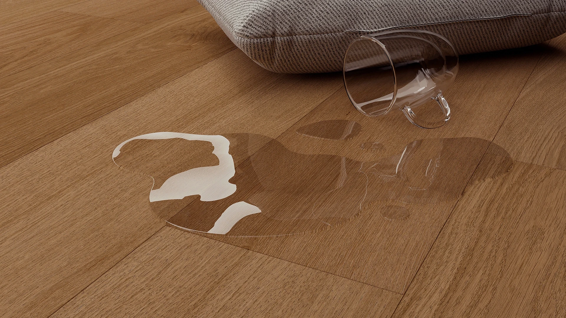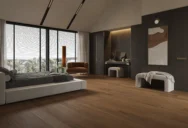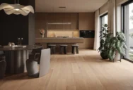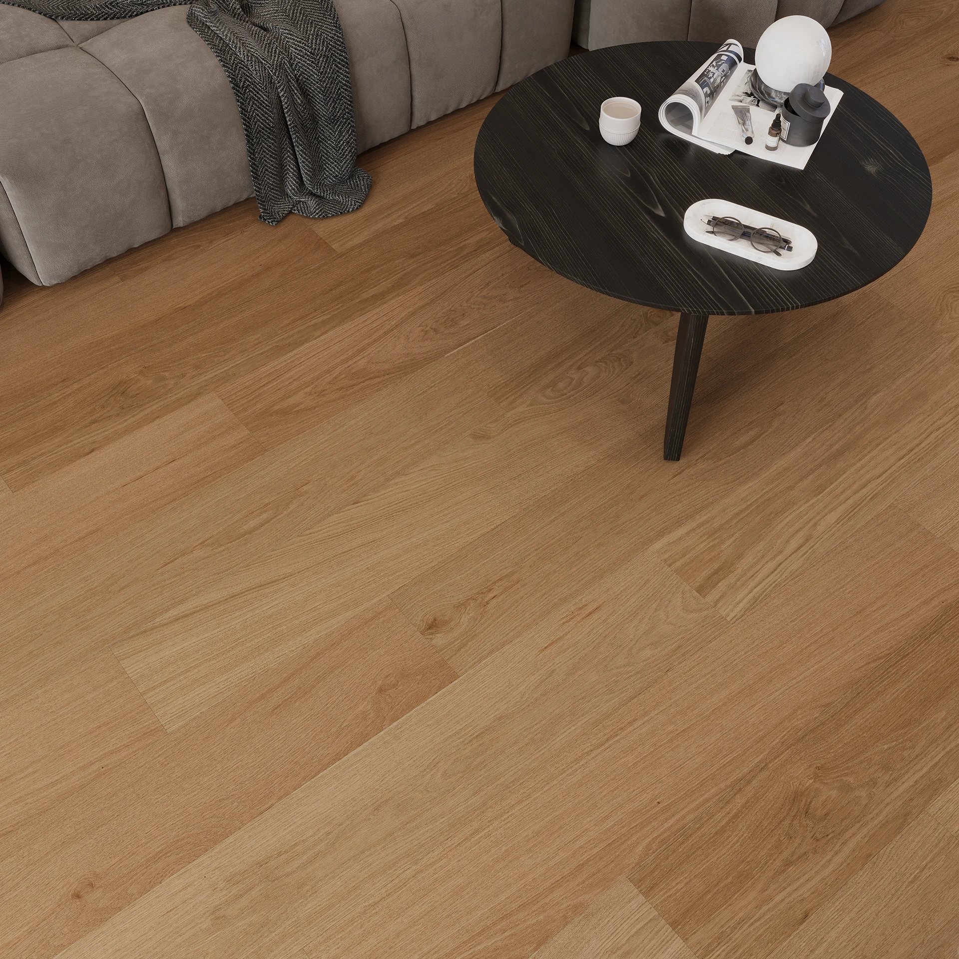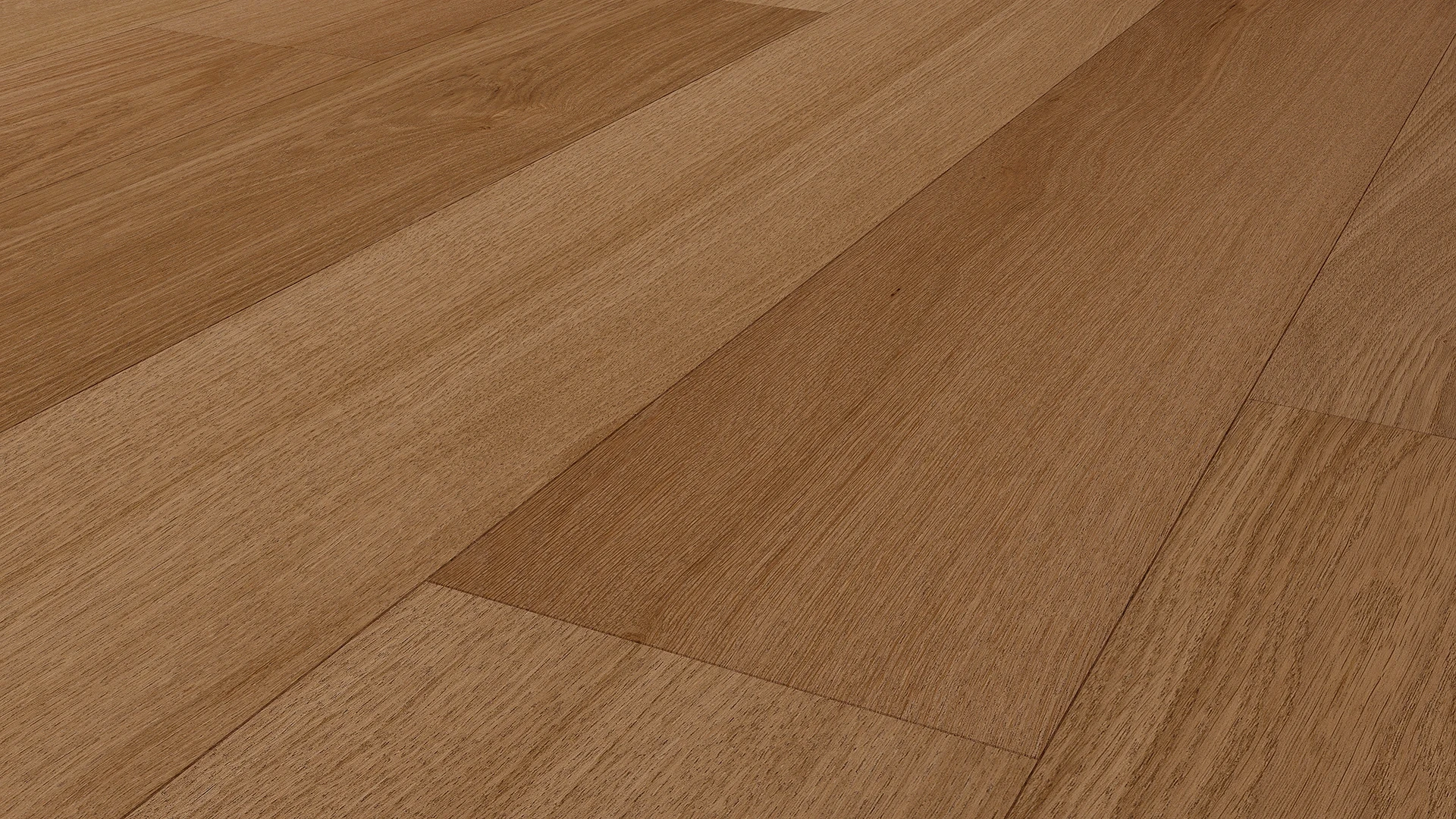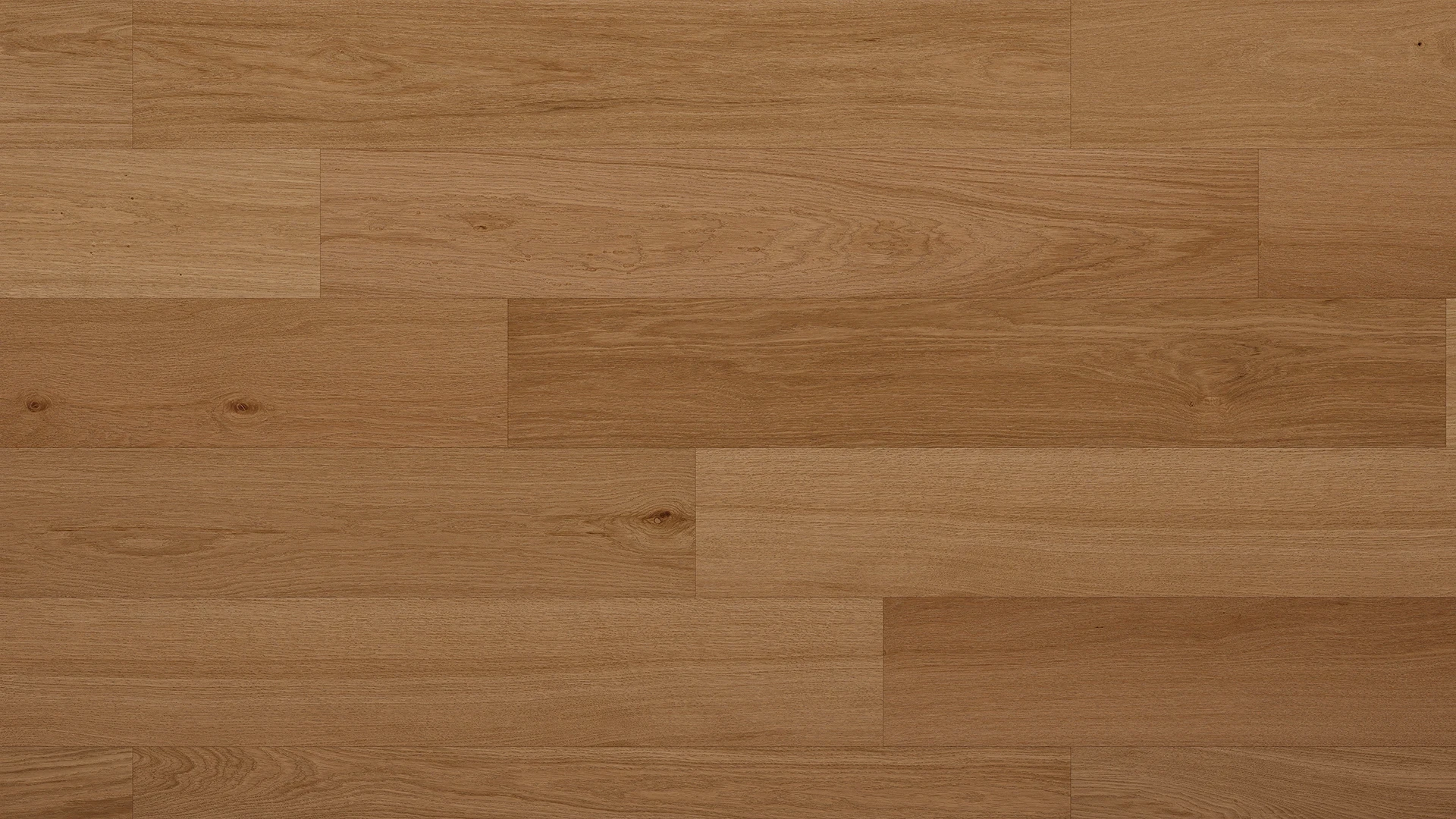 Pardoseala din stejar, într-o nuanță caldă de maro deschis, aduce o atmosferă naturală și confortabilă interiorului. Lemnul subtil închis la culoare accentuează caracterul stejarului și textura delicată.